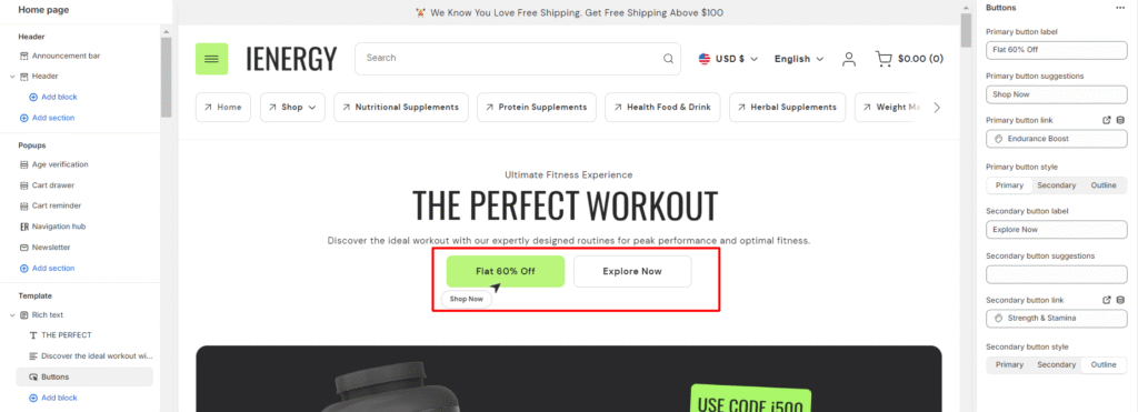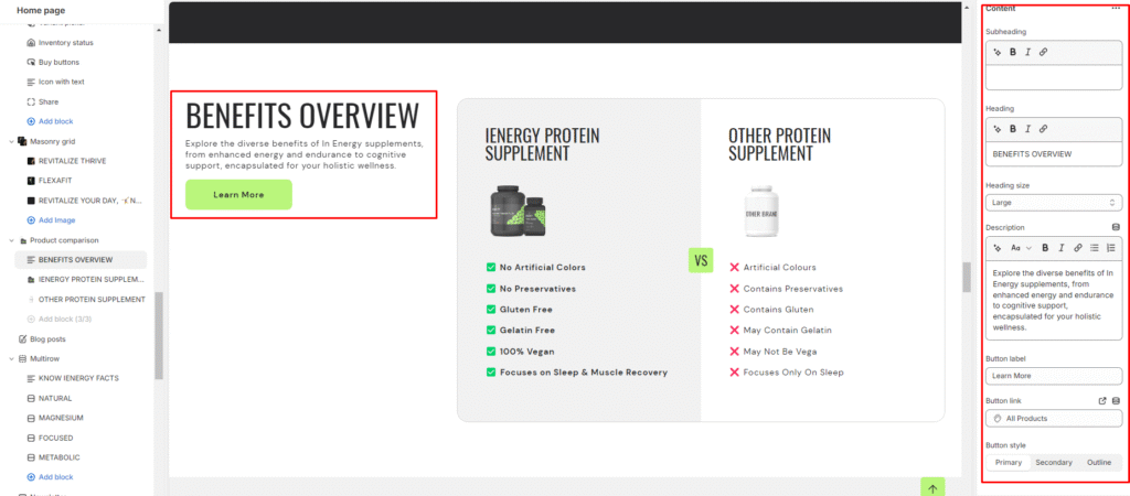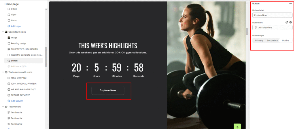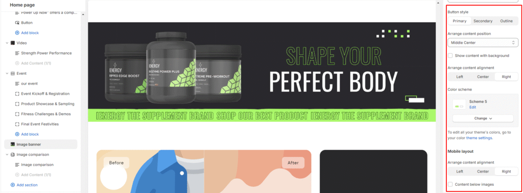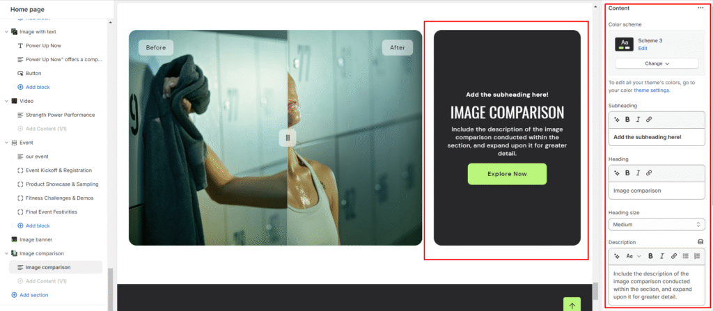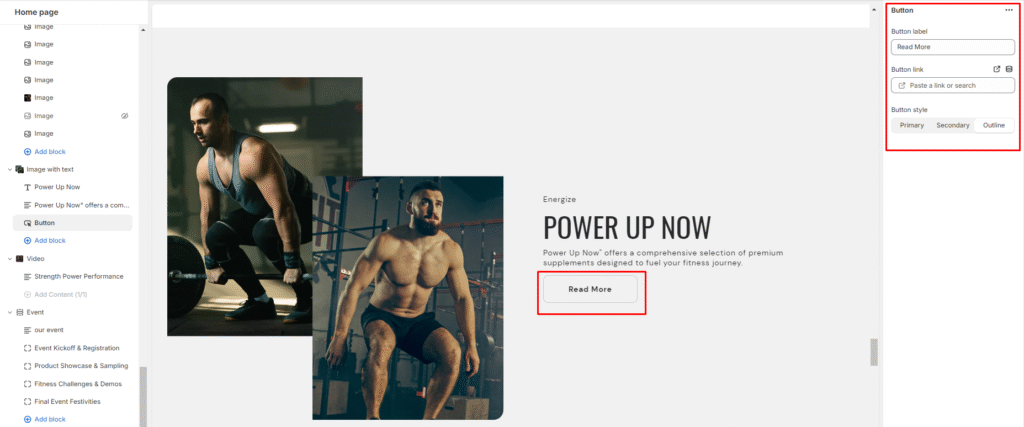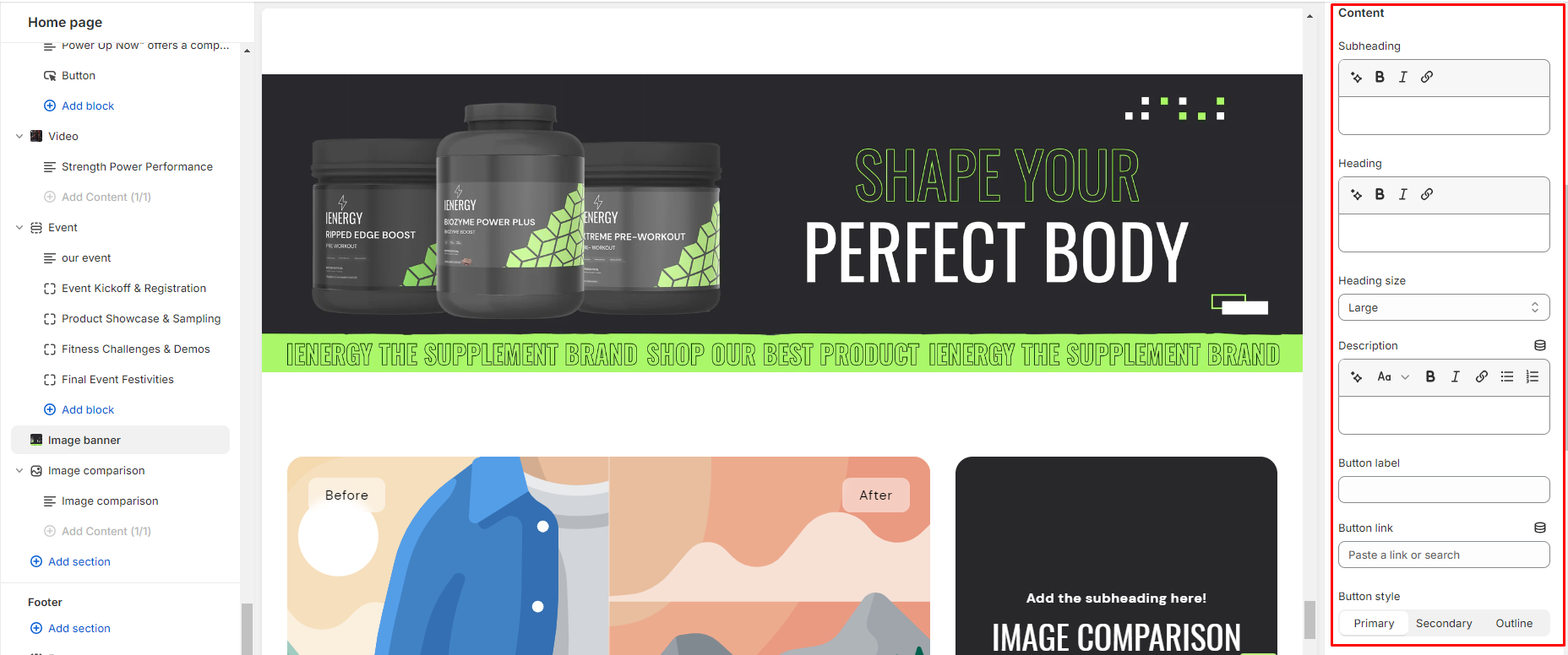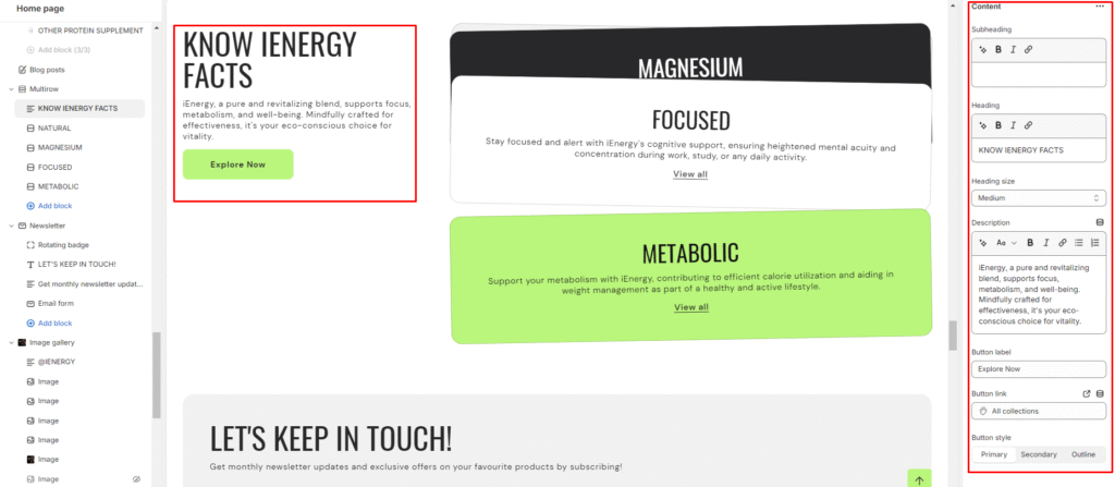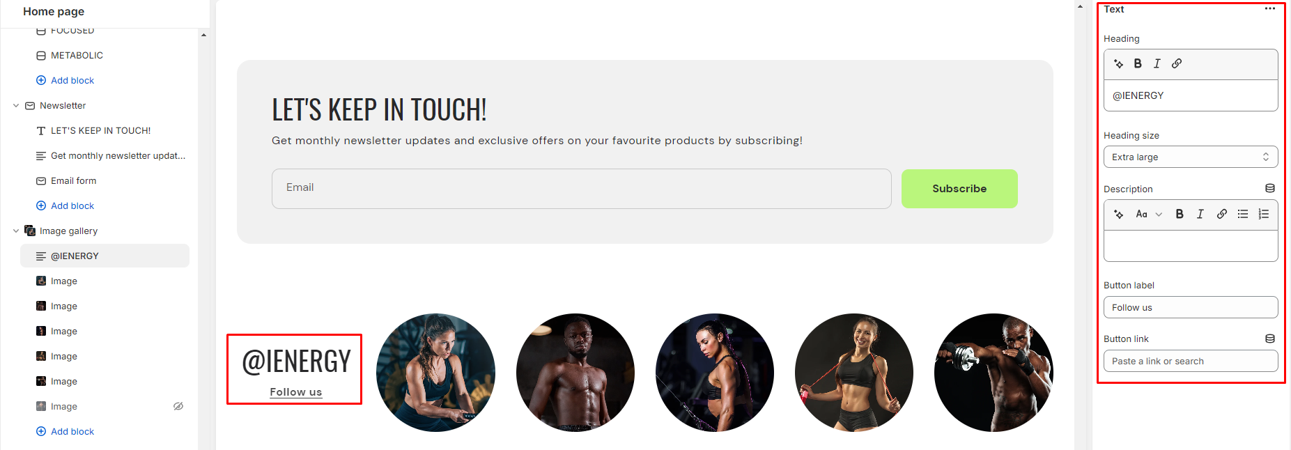 - Describe your image gallery in the provided fields, and enhance customer experience by adding a button label and linking it.