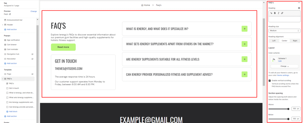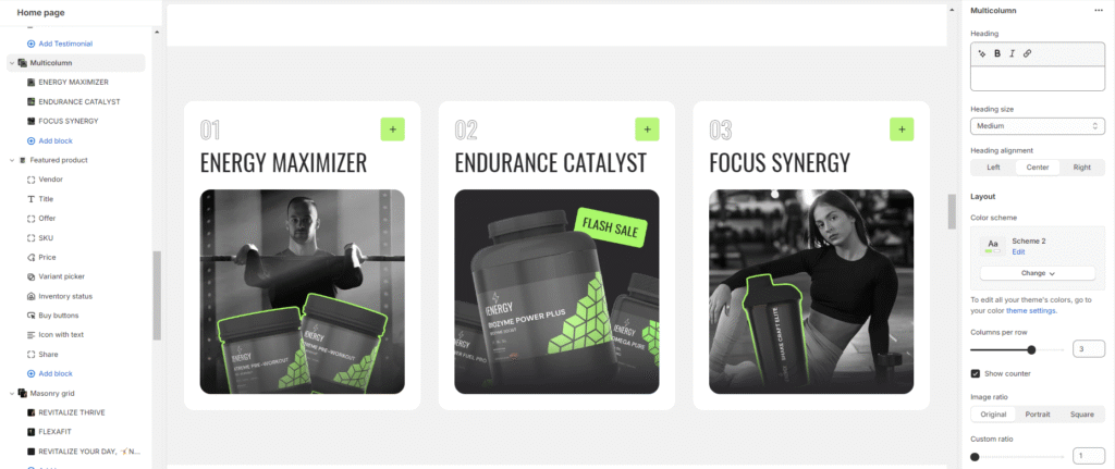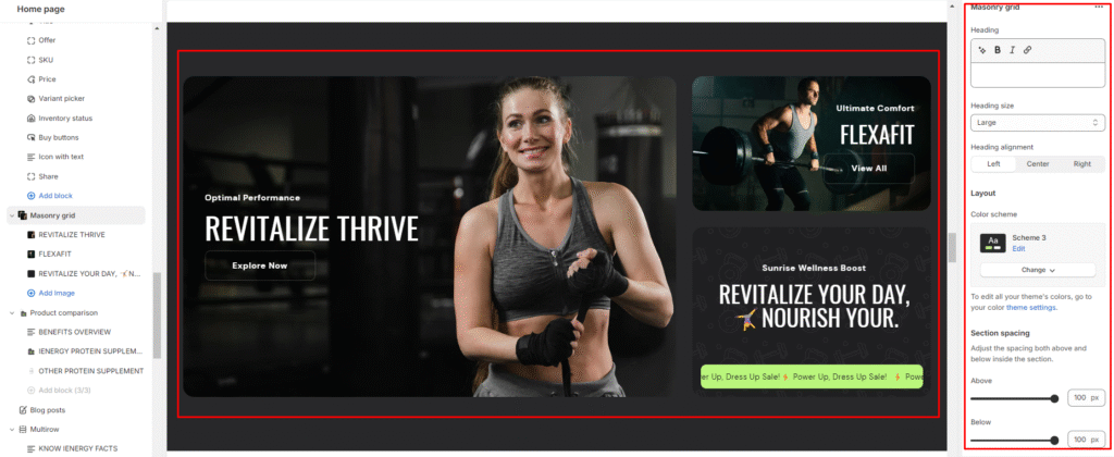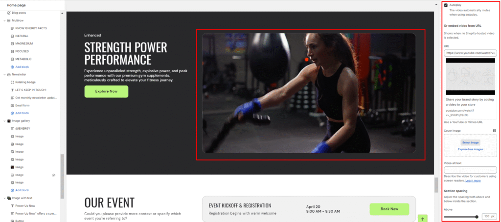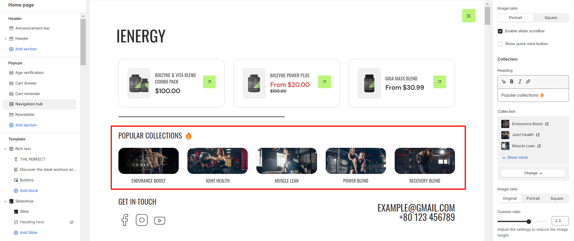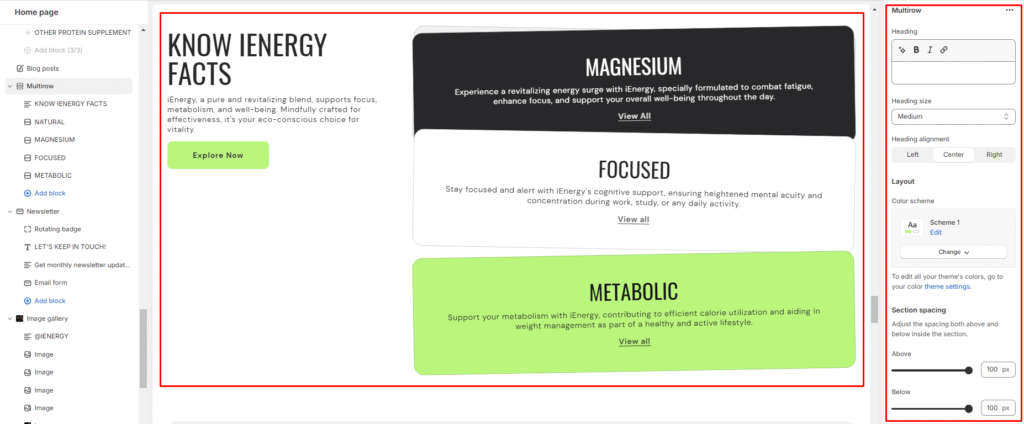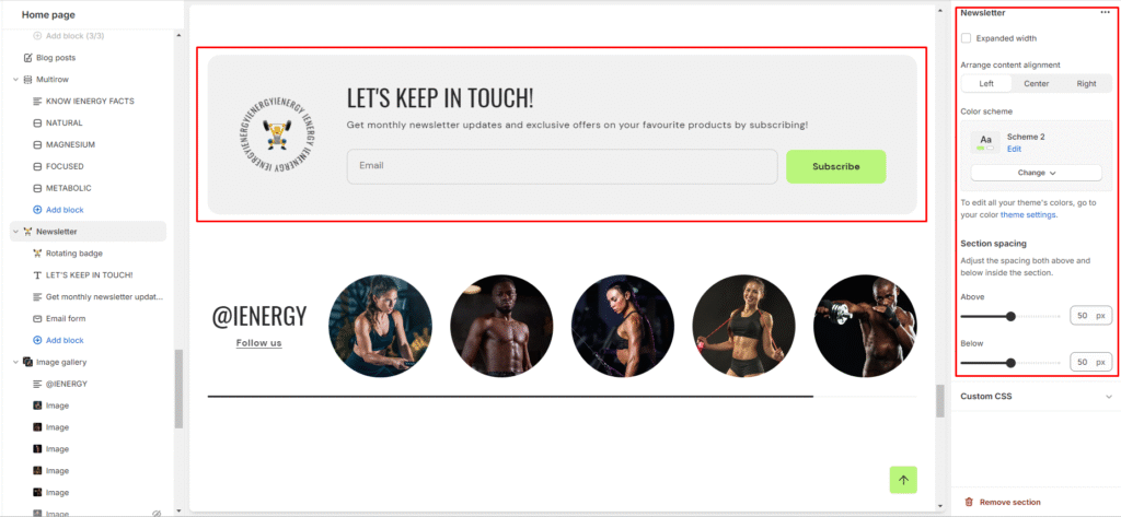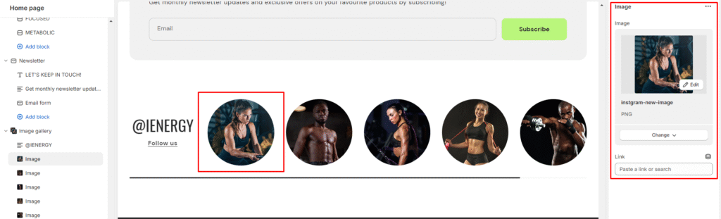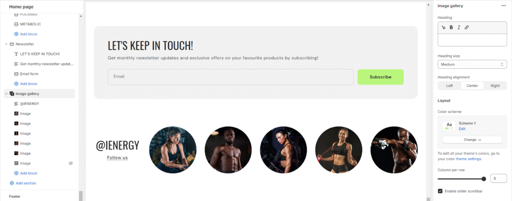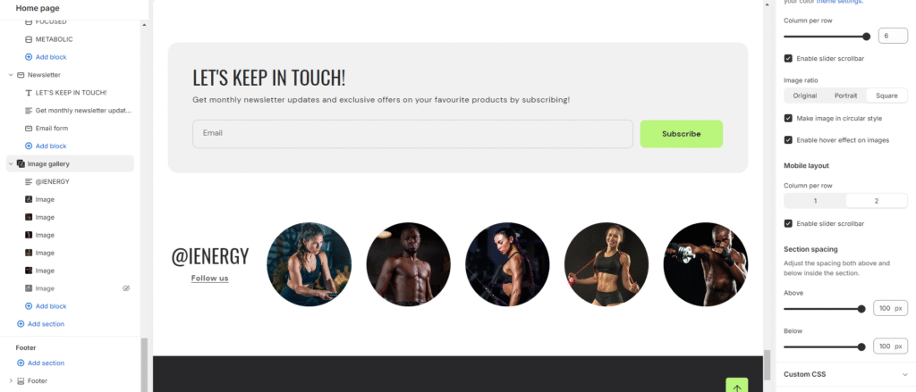 An image gallery section in the theme editor is a customizable feature that enables users to display a collection of images in a visually appealing and organized manner on their website. This section allows you to showcase multiple images in a grid or carousel format, providing a user-friendly way to present visual content such as product photos, portfolio images, or any other visual elements relevant to your website’s purpose. Users can typically upload, arrange, and customize the appearance of images within the gallery section to enhance the overall aesthetic and engagement of their website.