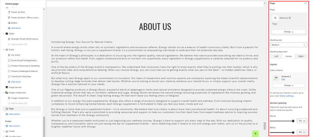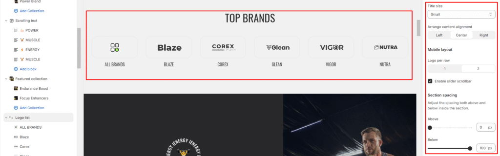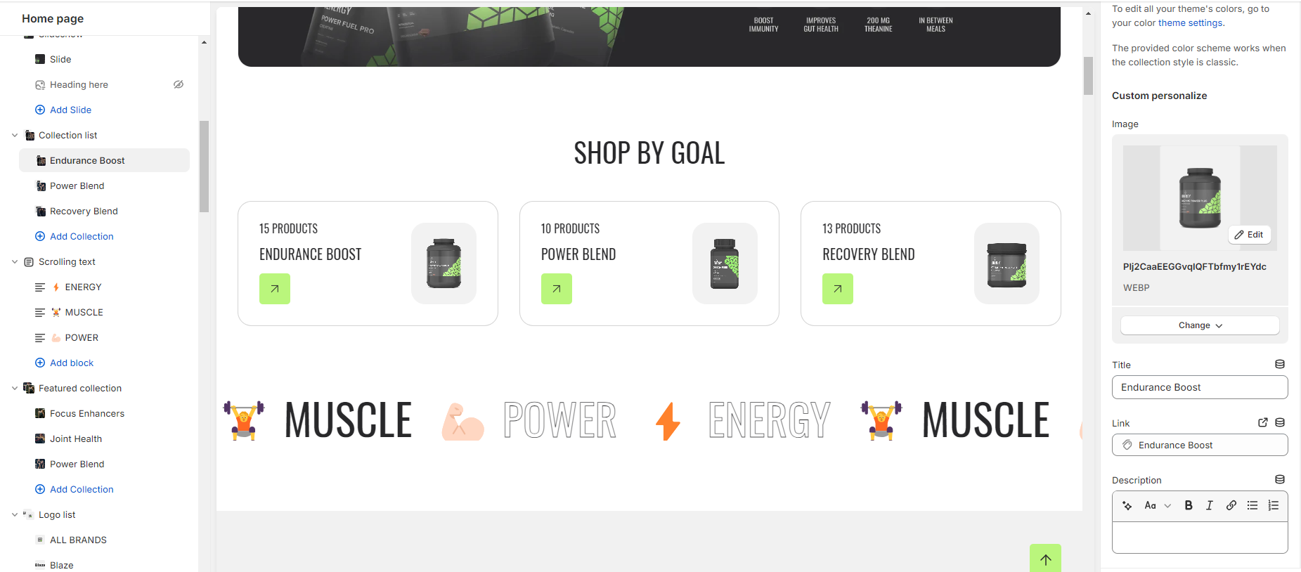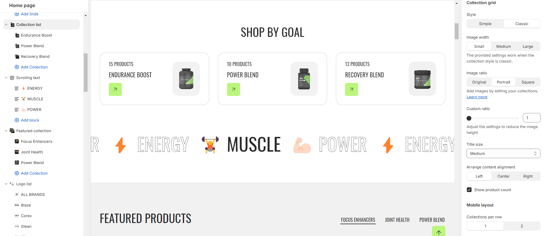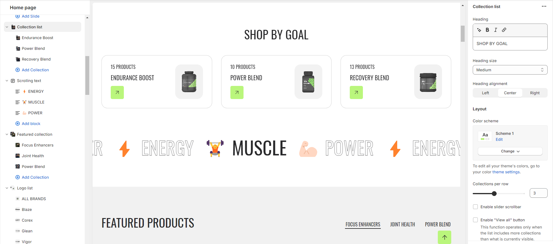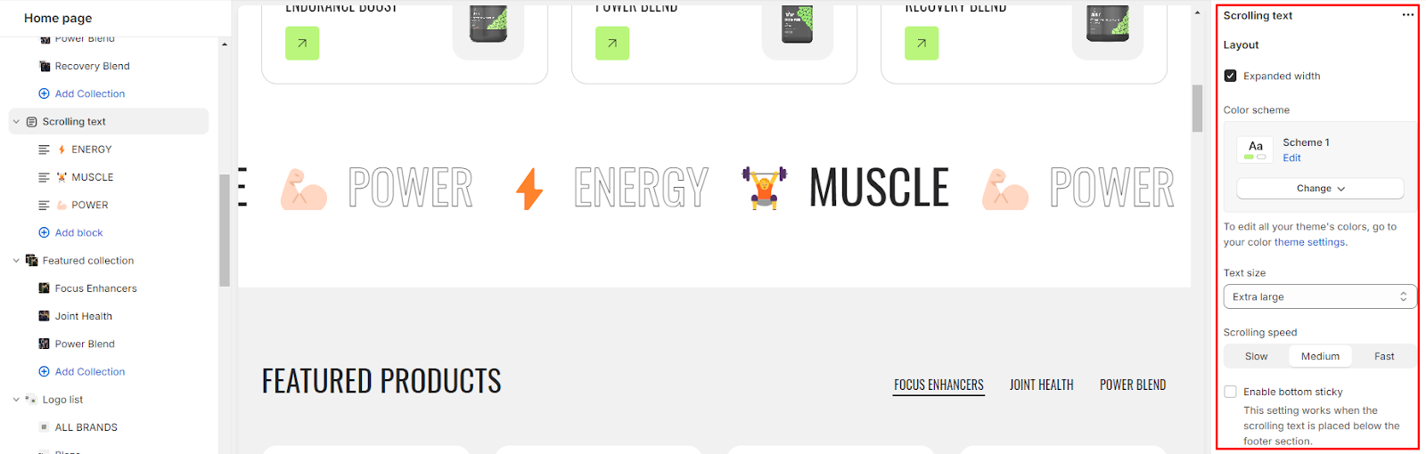 A scrolling text section in the theme editor is a customizable component that allows users to display text that moves horizontally across a specified area on their website. This dynamic feature is often used to highlight important messages, announcements, or promotional content in a visually engaging manner. Users can typically control the speed, space, and styling of the scrolling text, providing a dynamic and attention-grabbing element to enhance the overall design and interactivity of their website. This section is handy for conveying information in a space-efficient way, especially when dealing with limited-screen real estate.