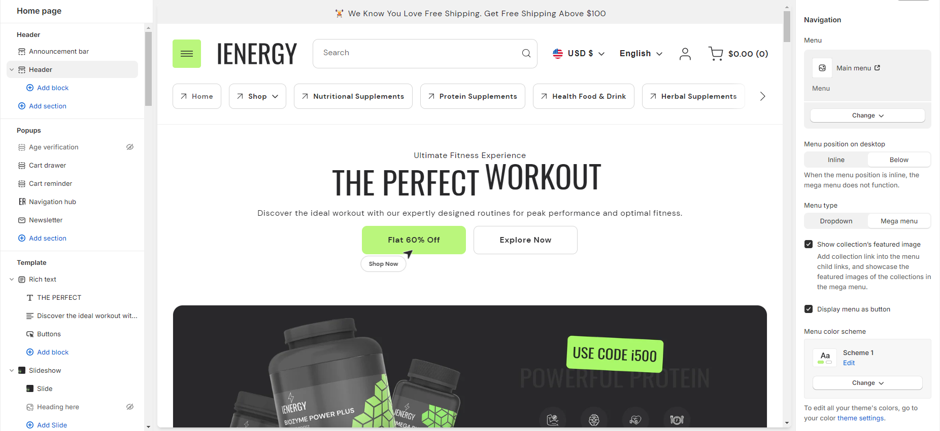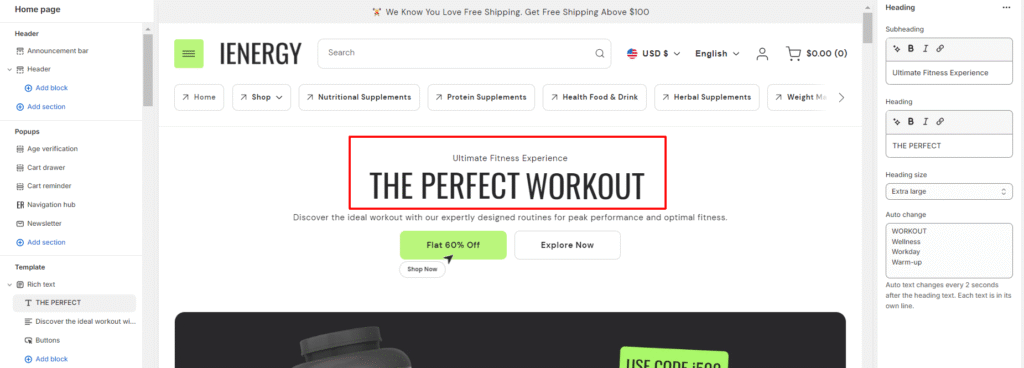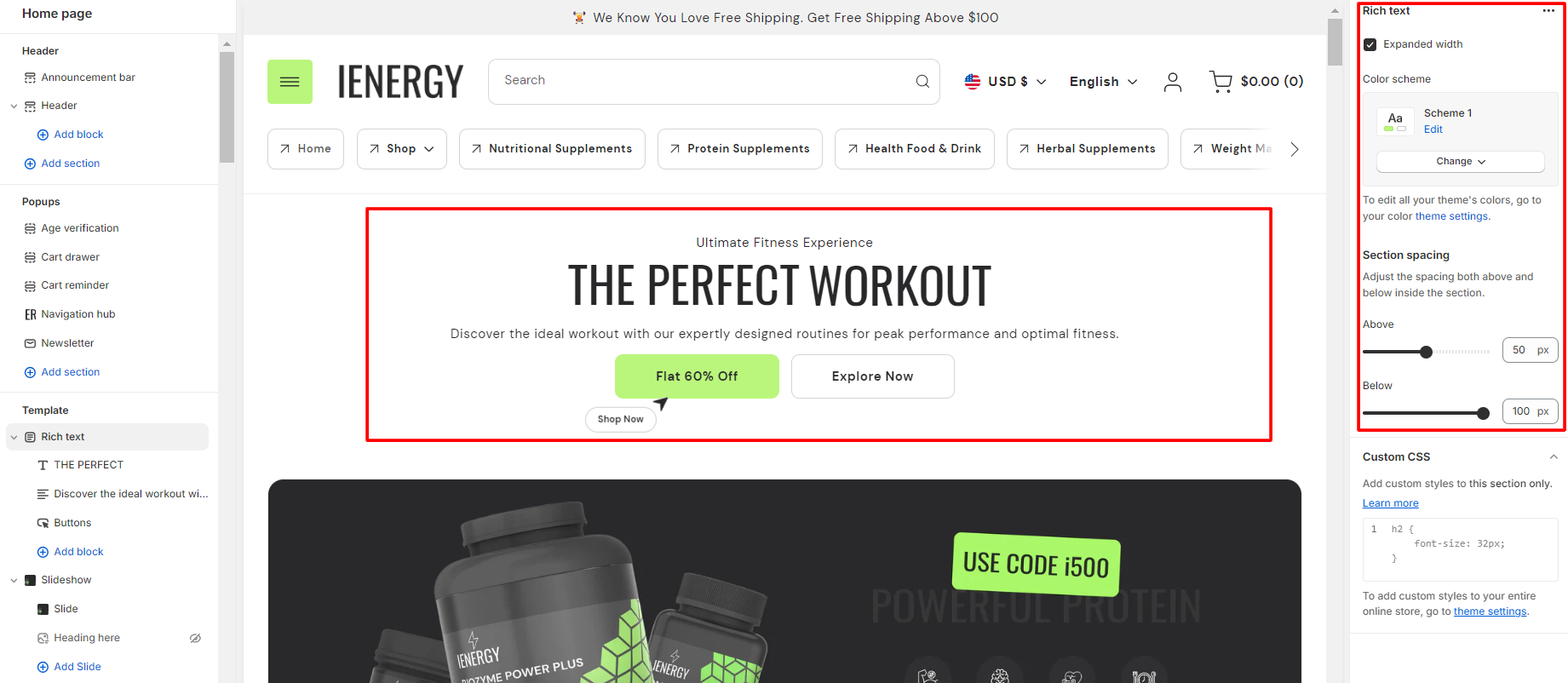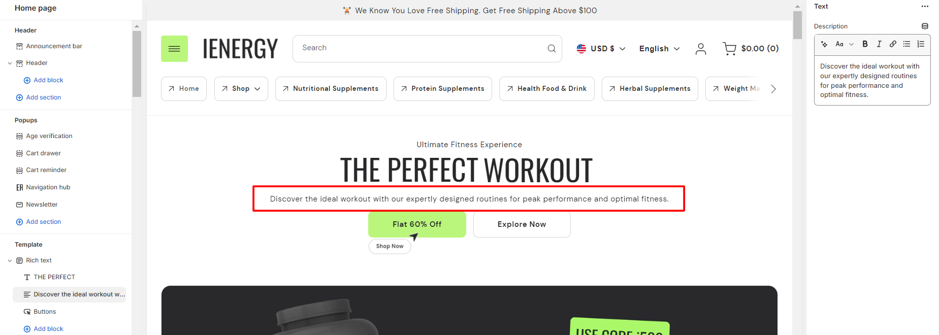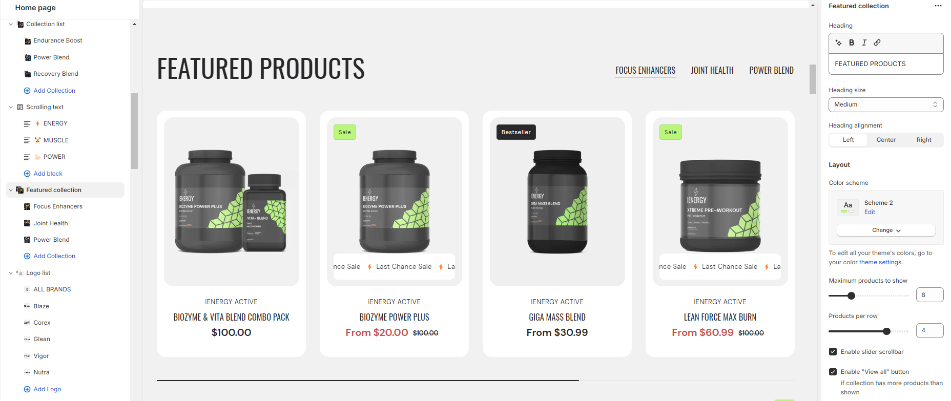 A scrolling text section in the theme editor is a customizable component that allows users to display text that moves horizontally across a specified area on their website. This dynamic feature is often used to highlight important messages, announcements, or promotional content in a visually engaging manner. Users can typically control the speed, space, and styling of the scrolling text, providing a dynamic and attention-grabbing element to enhance the overall design and interactivity of their website. This section is handy for conveying information in a space-efficient way, especially when dealing with limited-screen real estate.