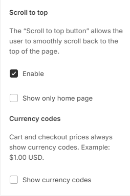 9.Currency codes: Choose whether to display currency codes alongside prices in your cart and checkout pages, for example, displaying “$1.00 USD” for clarity.
