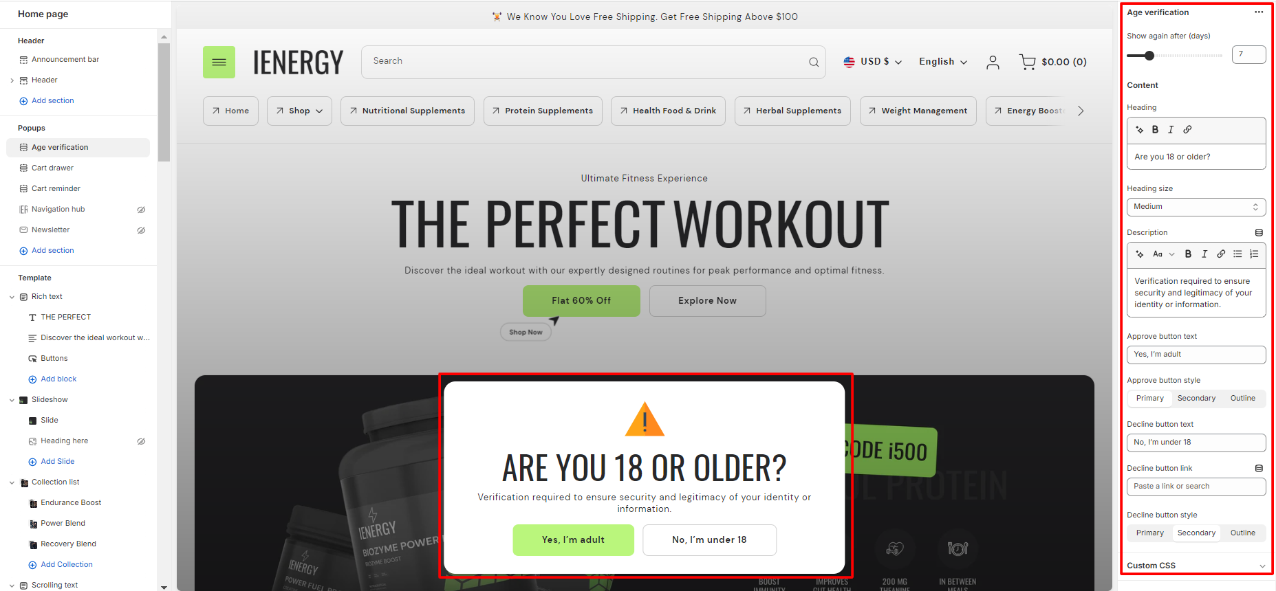 - Navigate to the “Popup” section and click on “Age Verification Popup.”This action will open up the settings for the Age Verification Popup on the right side of the screen.