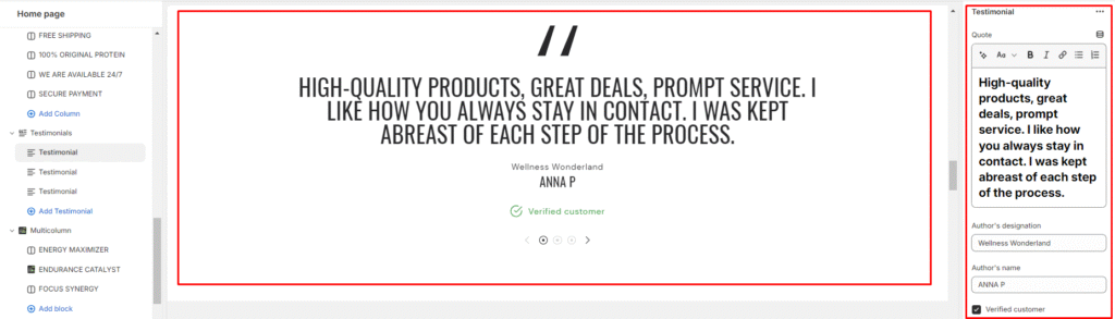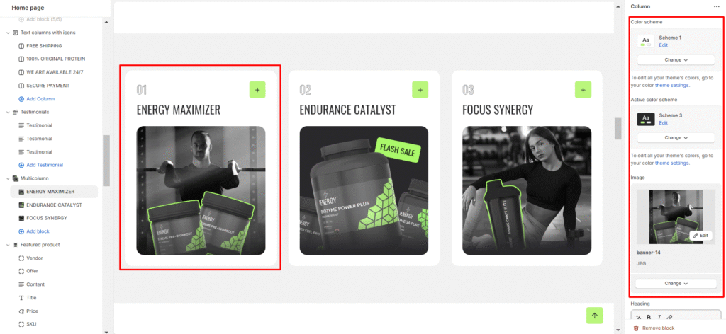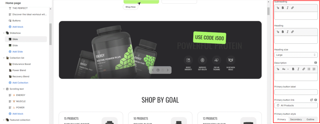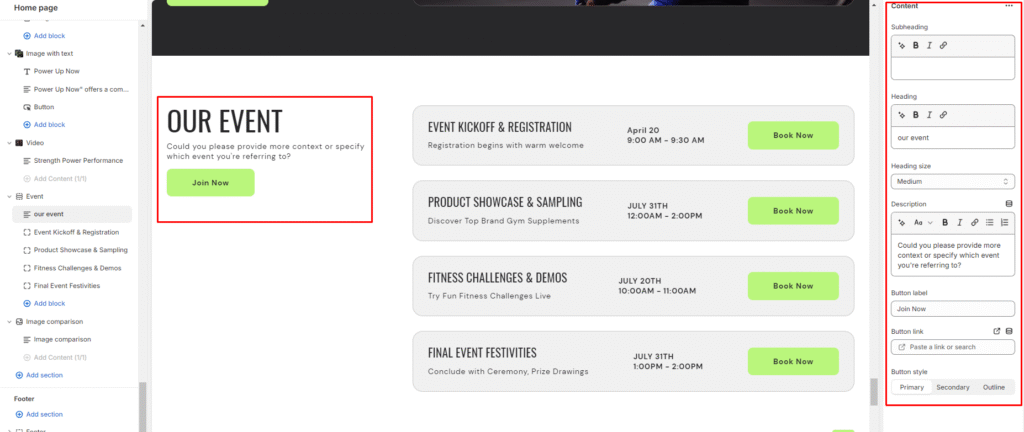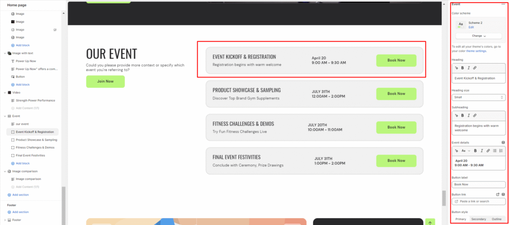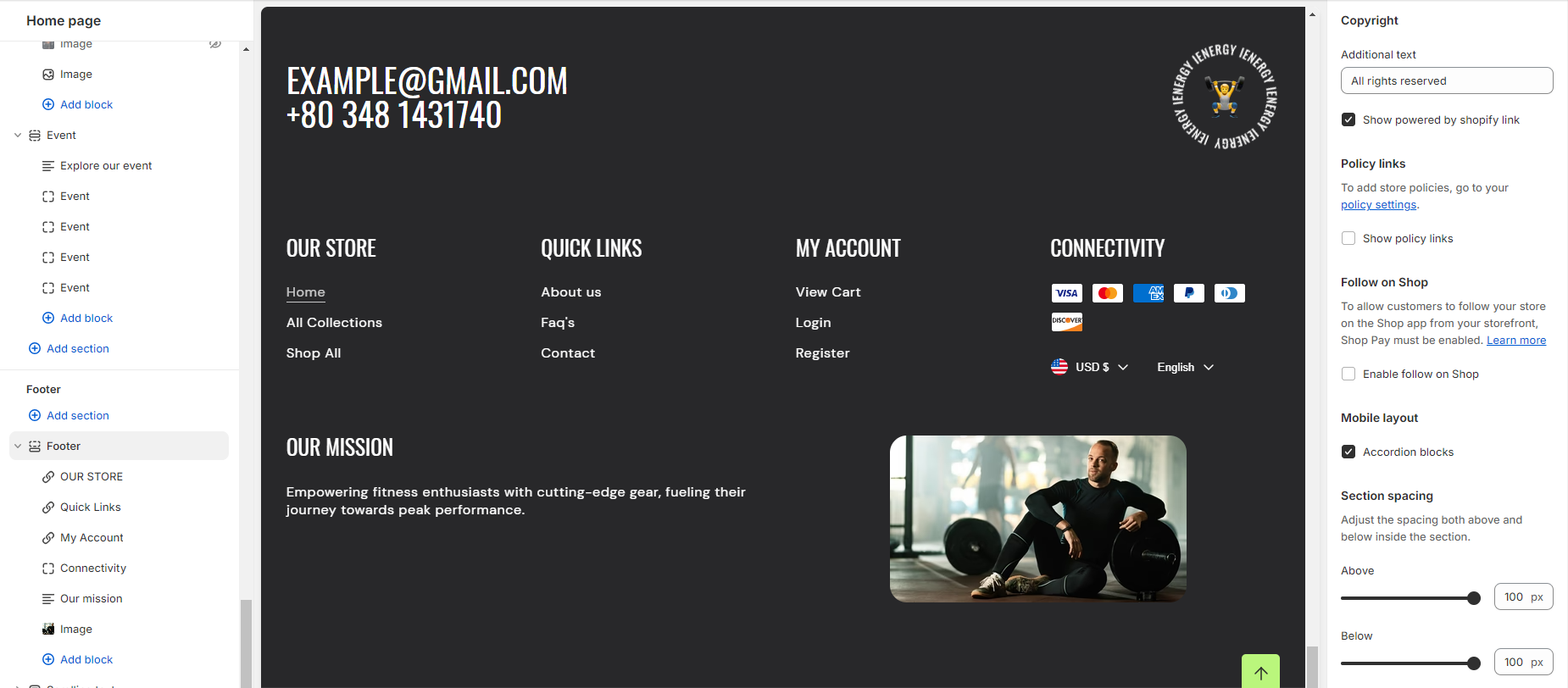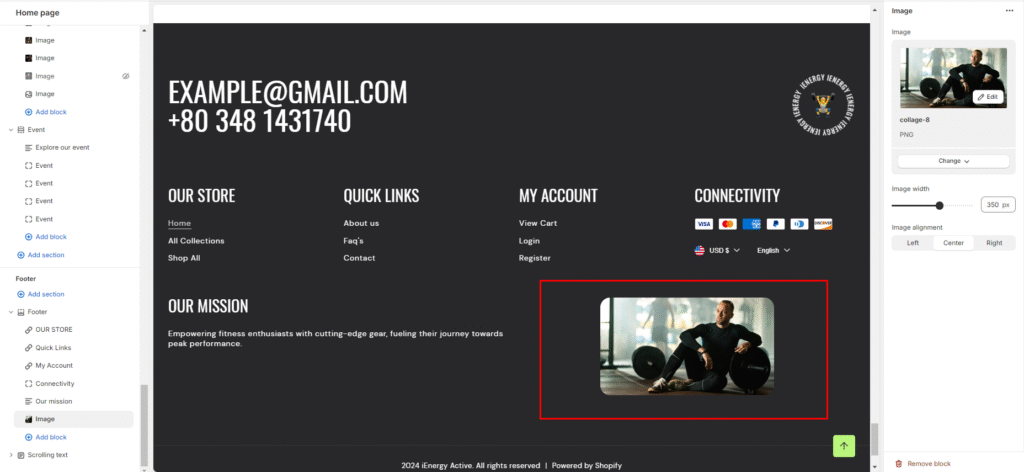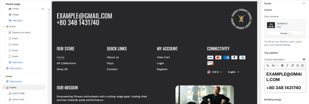 - Start by navigating to the footer section within the home page settings. You’ll find customization options located on the right side of the screen.