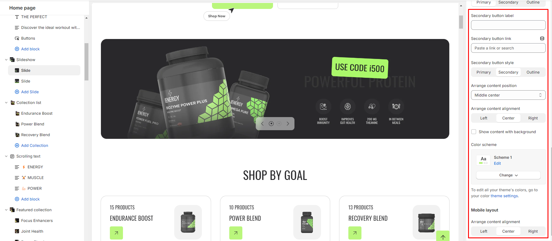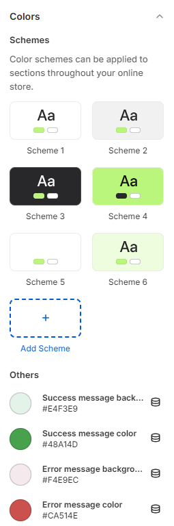 - Color Schemes: This section allows you to choose predefined color schemes that can be applied to different sections of your online store.