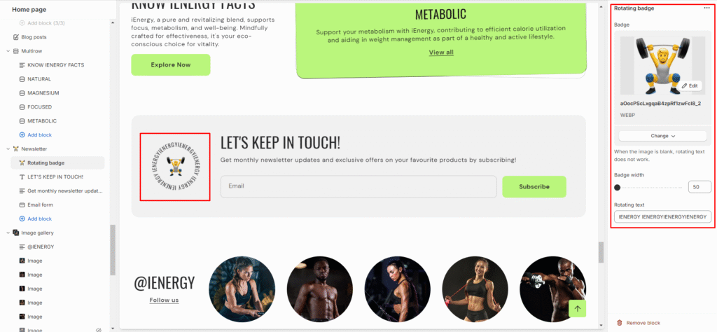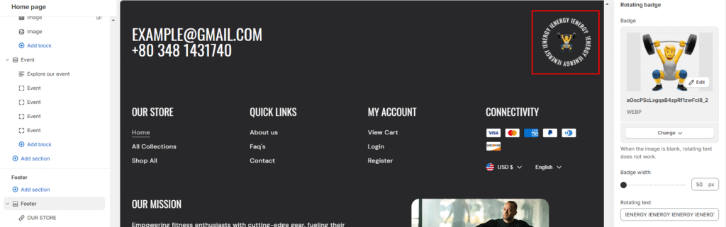 4.To set up the rotating badge, first, upload images and input rotating text in the designated field. Additionally, you can customize the badge width using the slider.