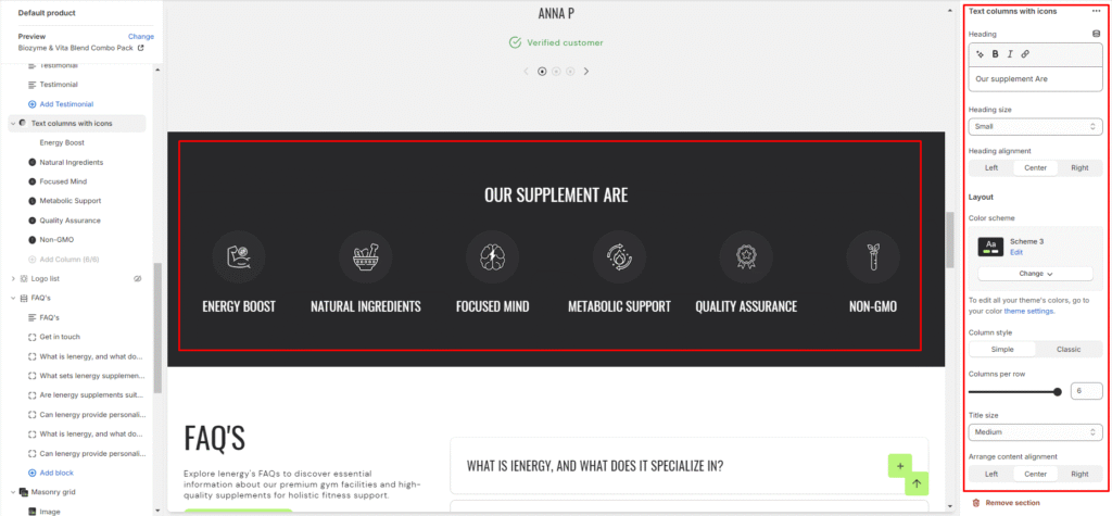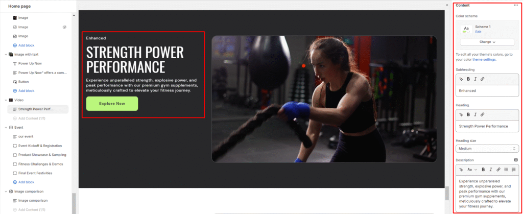 - Once the image gallery section is added, you can choose to include both image and text blocks within that section.