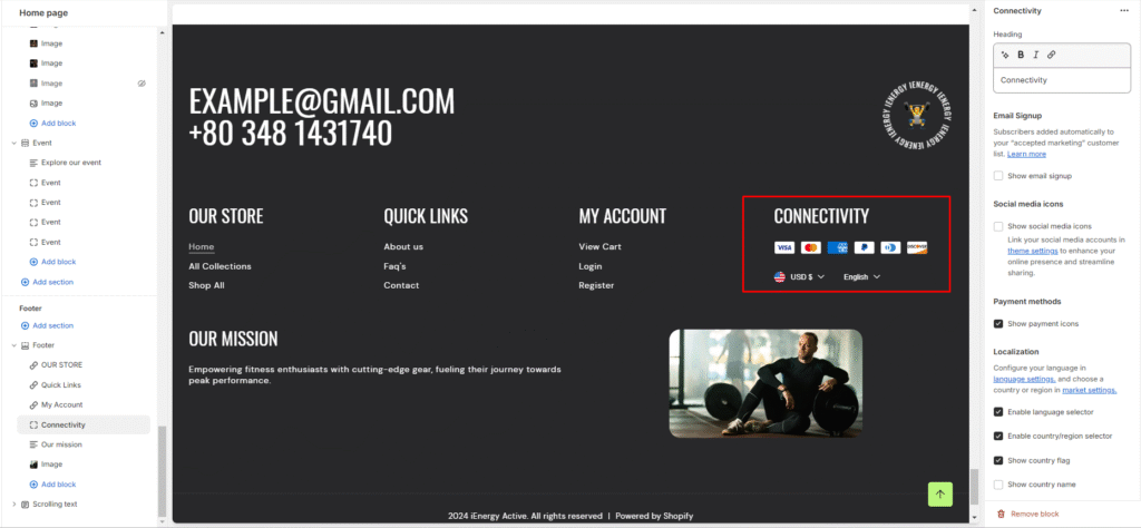 - In the footer section, you have four blocks available: Menu, Connectivity, Text, and Image. These can be added according to your needs.