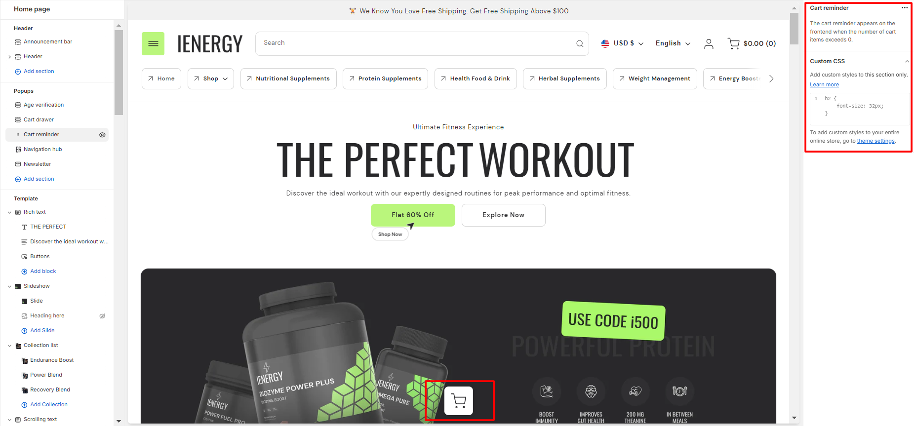 - Free Shipping Message: Enable the option to display a free shipping message within the cart section and set the minimum order amount for free shipping to $500 or any other specified amount.
