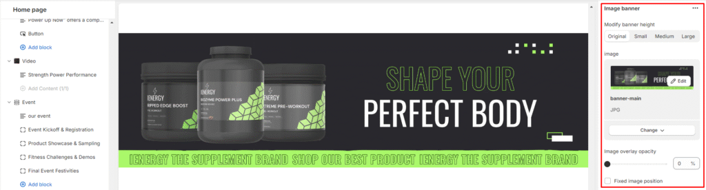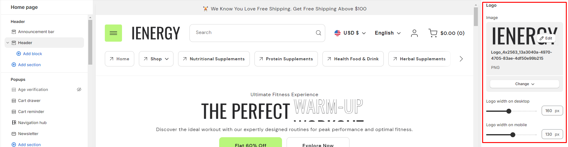 - Start by navigating to the header section within the home page settings. You’ll find customization options located on the right side of the screen.