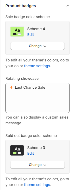 Here are the steps for configuring the Product Badges settings within the theme settings: