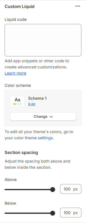 - Inside the custom liquid section, utilize the field provided to insert the liquid code. Include app snippets or other code for more advanced customizations.