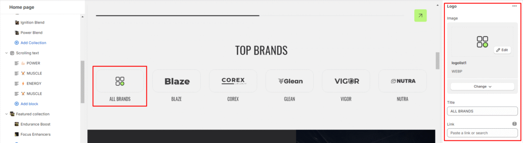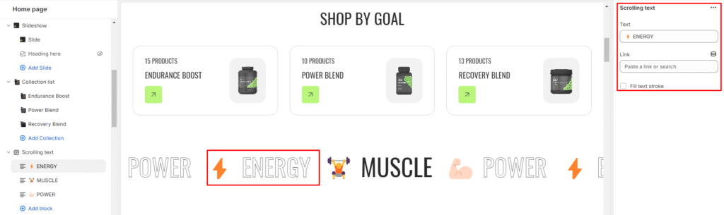 - After successfully adding the scrolling text section, you have the option to include both the scrolling text and scrolling social links block within this section.