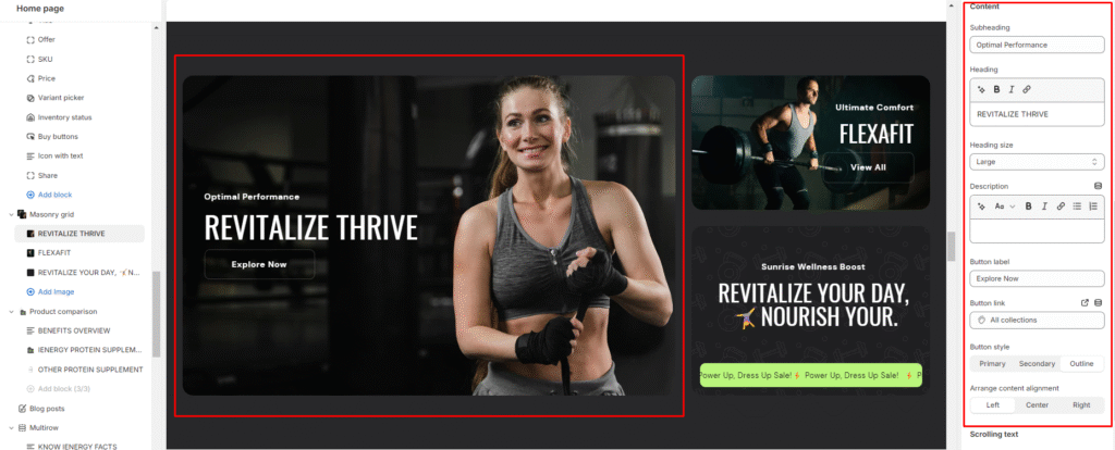 - Customize the settings of the image scrolling text section by accessing the options located on the right side after its addition.