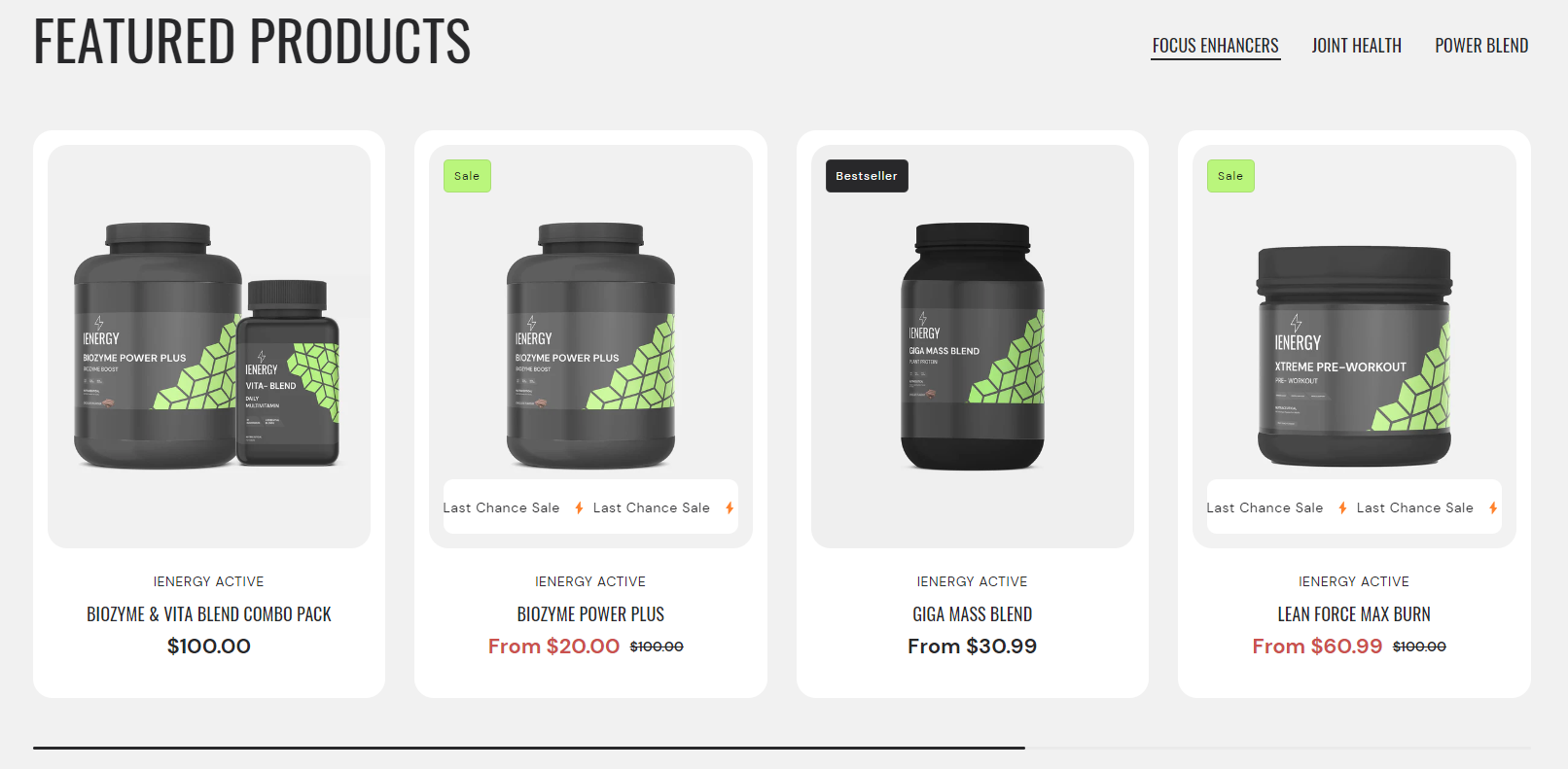 - Rotating Showcase: Optionally, you can display a custom sales message in addition to the sale badge. This message might be used to create urgency for limited-time offers or clearance sales.